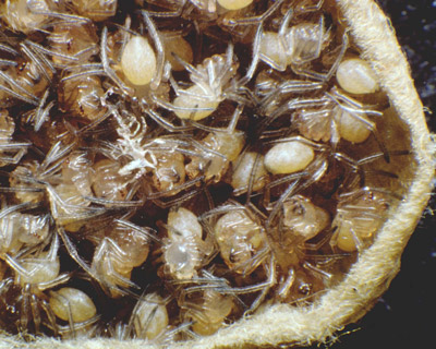 A female black widow spins silk around her eggs. This protects the eggs. The egg sac hangs from the web. Males live only a month or two. Females can live approximately one year.