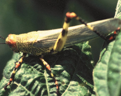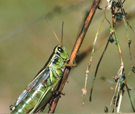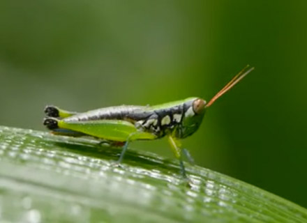 Most grasshoppers are green or brown. Some have markings. The markings can be black, red, or yellow. Grasshoppers have five eyes. They have two antennae.