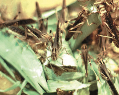 Grasshoppers mostly eat plants. They often eat grass. They also eat seeds, leaves, and bark. Some grasshoppers move and eat together in large groups. This is called swarming.
