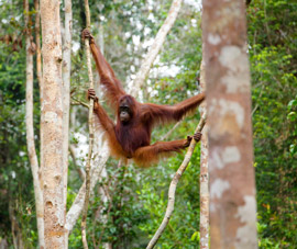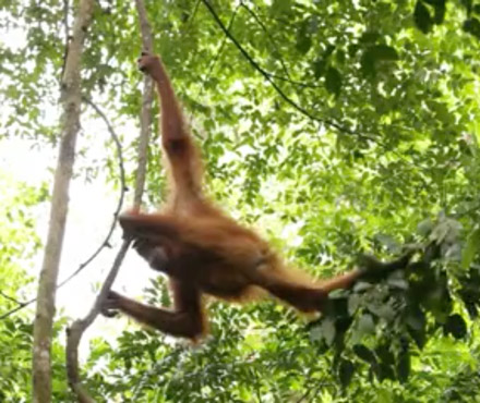 Orangutans live on two islands in Indonesia. The islands are called Sumatra and Borneo. You can find orangutans in rain forests. Orangutans spend most of their time in the trees. They swing from branch to branch.