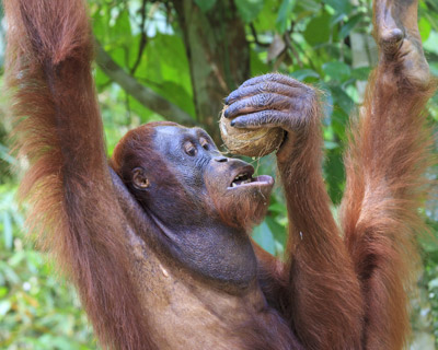 When awake, orangutans are usually looking for food. They eat leaves and flowers. They also eat a lot of fruit. They like mangoes and bananas.