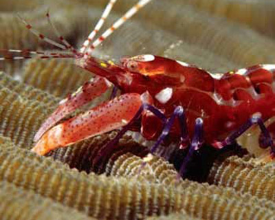 Shrimp have ten pairs of legs. They use five pairs of legs to walk. The other legs help the shrimp swim. Shrimp have eyes, but they do not see well. They use antennae to taste and touch.