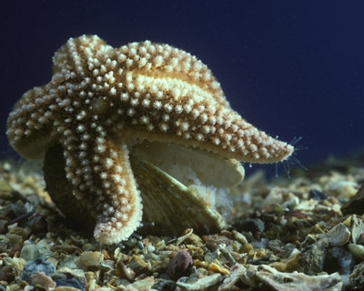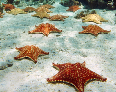 Starfish are invertebrates. Their bodies are flat. They are sometimes brightly colored. Starfish have toxins in their bodies. The toxins help prevent starfish from being eaten.